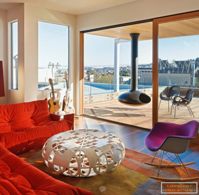 Цікавий і незвичайний в даному середовищі холодильник я Smeg, який злегка не вписується в спроектовану середу, але, тим не менш, спеціально сконструйовані для нього ніша дозволяє йому більш гармонійно виглядати. Ми бачимо тут ще один цікавий варіант - глянцева стеля з кластером світильників.