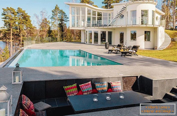 На останньому вільному просторі в протилежних кінцях кімнати розташовані ліжко і м'які меблі зі столом у вітальні зоні.