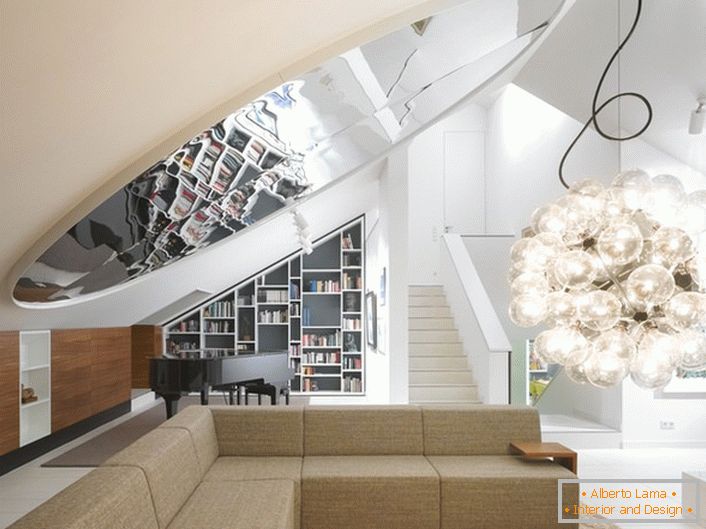 Вітальня на другому поверсі заміського будинку прикрашена натяжними стелями з фотодруком.