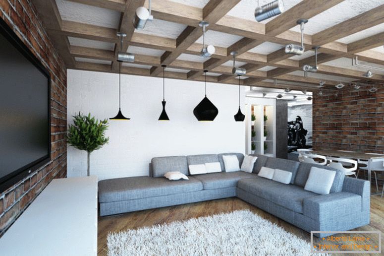 Скандинавський стиль підходить для оформлення квартир студії. У великій вітальні можна при допомогу тканинної ширми виділити зону відпочинку, помістивши ліжко в своєрідну нішу.