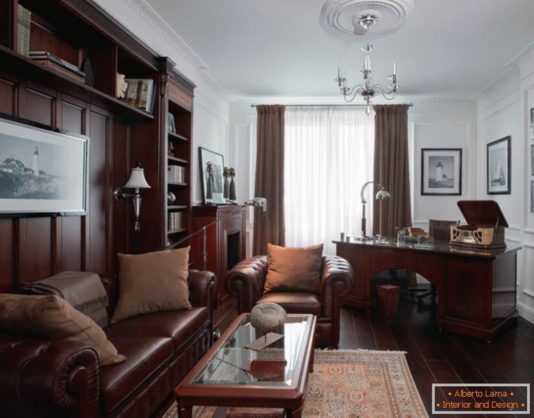 Меблі бажано використовувати дерев'яну, але допускається вносити в дизайн інтер'єру глянцеві робочі поверхні.