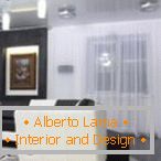 Складений план передбачав створення відкритого простору. Але компактну спальню дизайнер все ж вирішив ізолювати. Її відділяє від іншої частини приміщення засклена металева перегородка. Далі йде вітальня, яка межує з робочим столом обідньої області.