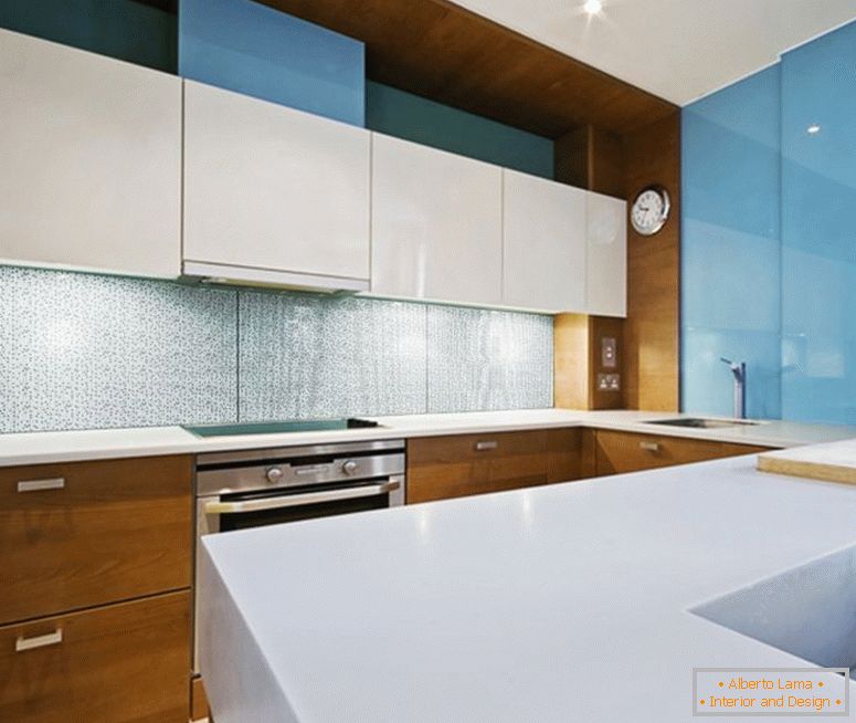 Кухня, ванна кімната і обідня зона, обладнана у передпокої, оформлені в сучасному стилі, вираженому в даному випадку великою кількістю білого кольору і глянцевих поверхонь, лаконічністю обстановки і графічним декором.