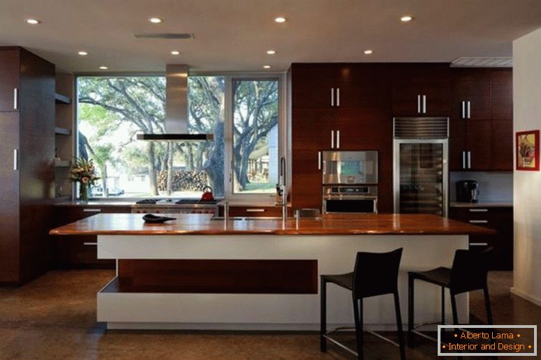 Інтер'єр в цьому проекті нейтральний. Включає в себе грунтовний мінімалістичний стіл, систему зберігання. Все витримано в м'яких і світлих тонах. Денне світло надходить через розсувний фасад, який при необхідності можна закрити алюмінієвими «віконницями».